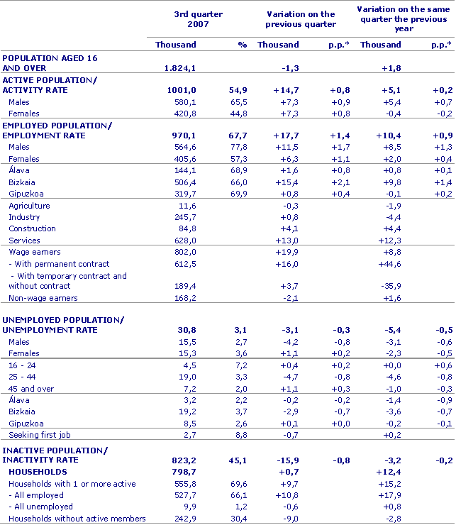 The employed population grew over the twelve-month period by 10,400, or 1.1%. This increase was seen in two of the three provinces, with the creation of 9,800 net jobs in Bizkaia and 800 in Álava, while Gipuzkoa remained unchanged. By sector, the services sector generated the most jobs, with 12,300 more, followed by construction with an increase of 4,400 net jobs. On the other hand the level of employment in industry fell by 4,400 people, although as mentioned earlier, the negative trend was broken in the third quarter with a increase of 800 people employed in industry and finally, in the primary sector 1,900 jobs were lost.