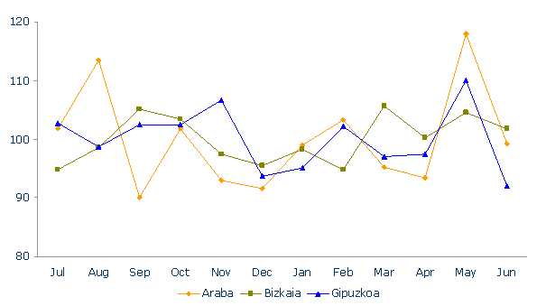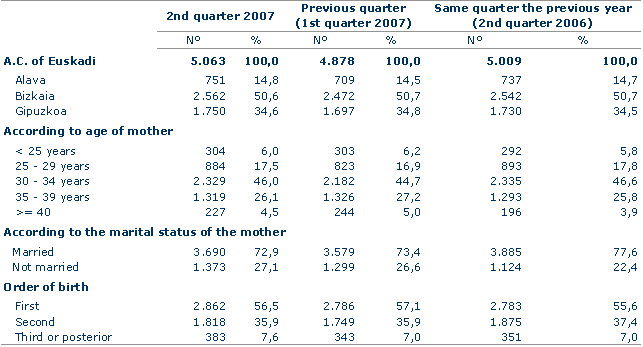 As refers to birth sequence, over half of the children, 2862, were first children in the second quarter of 2007; 1818 children (35.9%) came to families where there already was another child and the percentage of third or later children reached 7.6%. Bizkaia (40.2 %) was the only Historical Territory in which the proportion of second or later children was below that of the Autonomous Community of the Basque Country as a whole, which amounted to 43,5%. On the other hand, Alava and Gipuzkoa were above that percentage, reaching 44.6% and 47.8%, respectively.