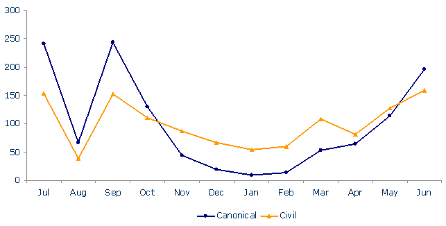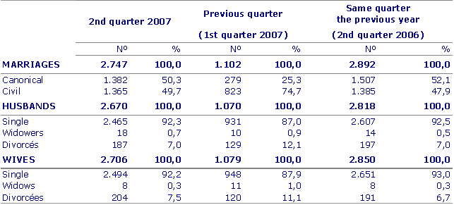 2,747 marriages were registered in the A.C. of the Basque Country in April, May and June of 2007 meaning a decrease of 5% with regard to the same quarter of the previous year. By province, residents of Bizkaia held 1,423 weddings, followed by those of Gipuzkoa, with 895 and those of Álava, with 342. In the case of residents from outside the A.C. of the Basque Country, the number of weddings came to 87.
