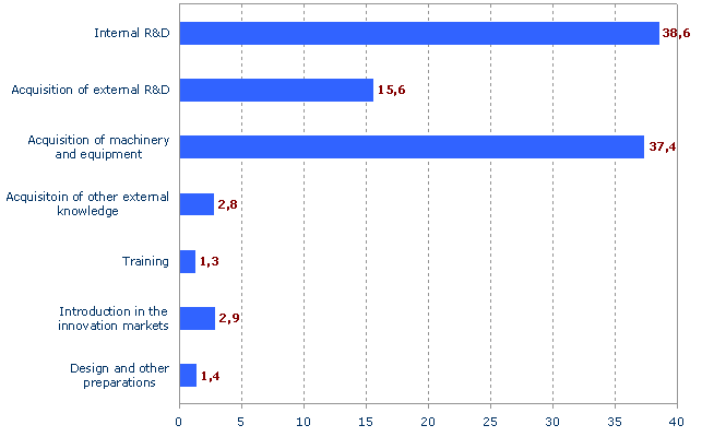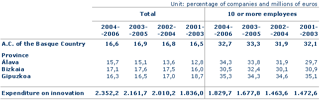 Expenditure made by Basque companies during 2006 on technological innovation activities came to 2,352 million euros, having increased by 8.8% as regards the previous year, according to Eustat data. This expenditure represented 3.8% of GDP and if this figure is broken down into the main activities needed for innovation, most notable is expenditure on internal R&D with 38.6% of spending, acquisition of machinery and equipment, with 37.4% and acquisition of external R&D, with 15.6%, leaving 8.4% for other activities.