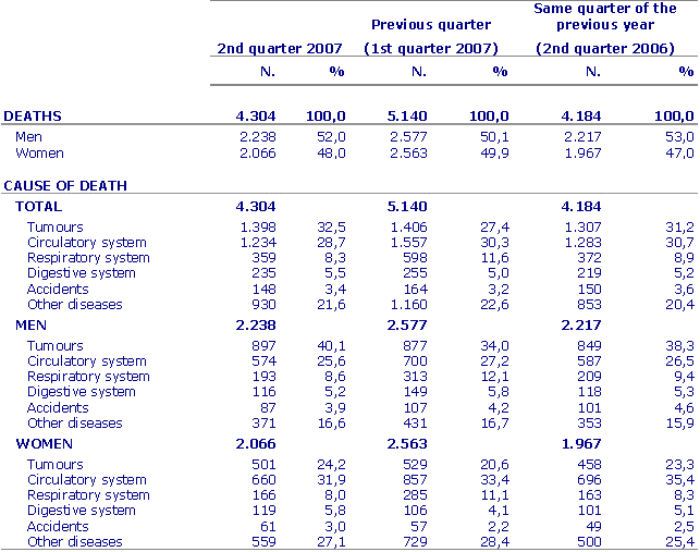The main cause of death was tumours, with 1,398 people dying for this reason (32.5%). The second cause of death was circulatory system disease, which gave rise to 1,234 deaths (28.7%) and the third place was held by respiratory disease, which caused 359 deaths (8.3%) during these months.