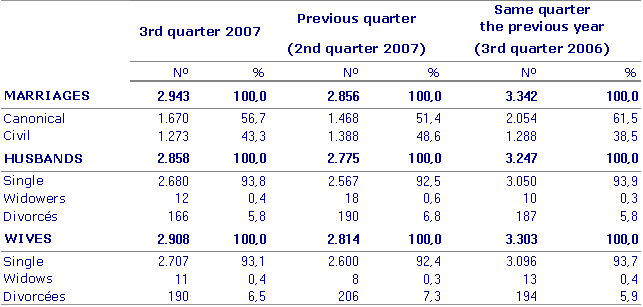 Fall in the number of marriages in the third quarter of 2007 as regards the same period of the previous year