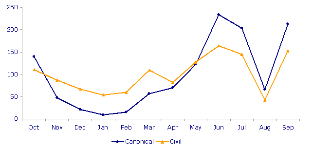 As regards the distribution of marriages according to the age of the couples, 55% of brides were aged over 30, whereas as for grooms this percentage rose to 73.1%.