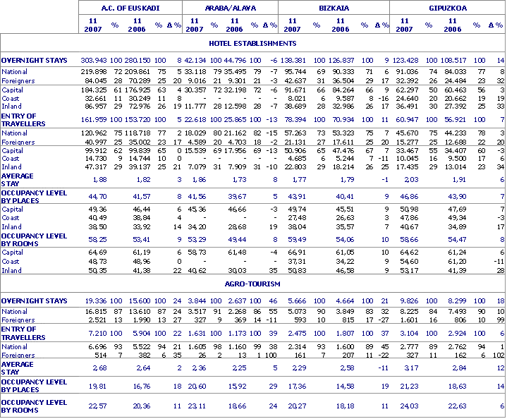 Among visitors from within the state an increase was registered for those coming chiefly from Catalonia, Castile and Leon, Galicia, Community of Valencia and Navarre and there was a decrease for those coming from Madrid, Asturias, Castile-La Mancha and Cantabria, among others. As for visitors from overseas, there was a rise for those coming from France, Portugal, Italy and the United Kingdom, among others, and a fall for those from Holland, Ireland, USA-Canada and Japan, among others.