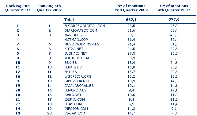 Other pages to have made significant progress were “wikipedia.org”, which went to the 12th position in the ranking, “elmundo.es” and “iberia.com”, all with rises of between 4 and 9 places in the ranking; in addition, there was a drastic improvement by the site “fotolog.net”, breaking in to the top 25 sites and rising almost 30 places in the classification, going from 51st to 22nd.