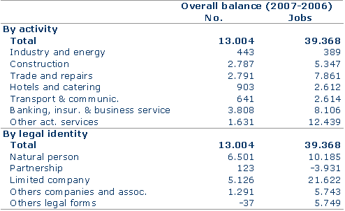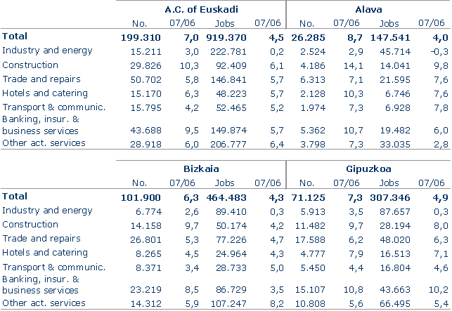 Companies operating in the A.C. of the Basque Country, except for those of the primary sector, carried out their activities in 199,310 establishments (factories, shops, offices, etc.) and employed 919,370 people in 2007, 4.5% more than the previous year, according to Eustat data. Employment in the A.C. of the Basque Country has grown by 130,707 since 2002; an average annual accumulated rate of 3.1%.
