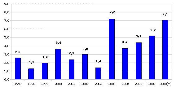 Amongst the prices of raw materials consumed by the sector with the highest inflation rates over the last twelve months are: Non-Metallic Minerals (16.4%), Electricity and Gas (12.2%), Water (11.4%) and Oil By-Product (9.0%). On the other hand there were less dramatic price increases in inter-annual prices (April 2008 compared with April 2007) of raw materials for Metallurgy (0.3%), Machinery (2.0%) and Timber Industry (2.1%).