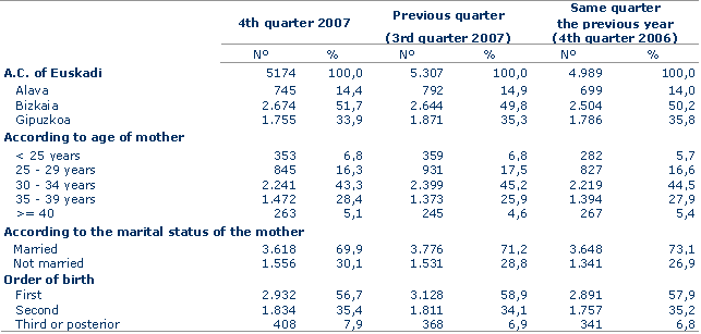 The number of children born in the Autonomous Community of the Basque Country in the last quarter of 2007 amounted to 5174, 3.7% above the total for the same period in the previous year, according to data from Eustat, the Basque Statistics Office. Of those children, 1796 were born in October, 1737 in November and 1641 in December. By territories, 745 children were born in Alava, 2674 in Bizkaia and 1755 in Gipuzkoa.