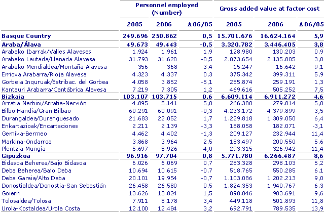 The Urola-Costa region accounted for the greatest growth in industrial activity in 2006 (13.9%), followed by Tolosa (11.8%) with Gernika-Bermeo and Plentzia-Mungia, both at 11.4%, according to Eustat data. On the opposite end of the spectrum was the only region with negative growth, Encartaciones (-3.1%). Valles Alaveses followed at +0.9% and then Estribaciones del Gorbea (+1.3%), although these three regions only represent 3% of total industrial employment in the A.C. of the Basque Country, some 7,952 people.