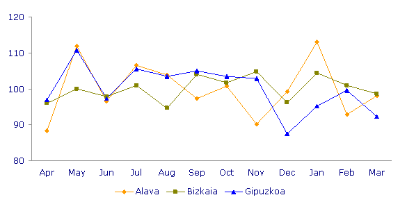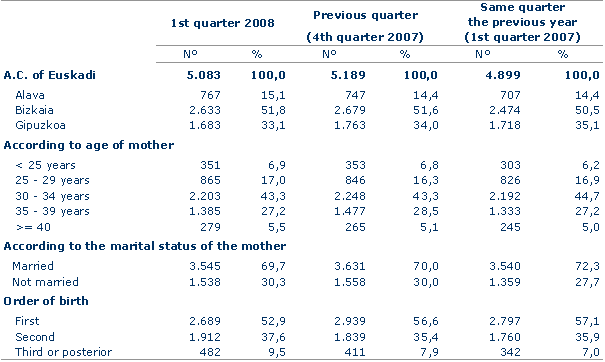 As refers to the distribution of births according the age of the mother, there continued to be a clear preponderance of the 30-34 year-old age group, in which almost half of the births took place. This group is followed by the next oldest group, aged between 35-39, which accounted for 26.1% and was ahead of the 25-29 age group, with 17% of births. At either end of the scale, the group of mothers under 25 accounted for 6% of births, whereas mothers over 40 lagged slightly behind, with 4.5% of the total of births.