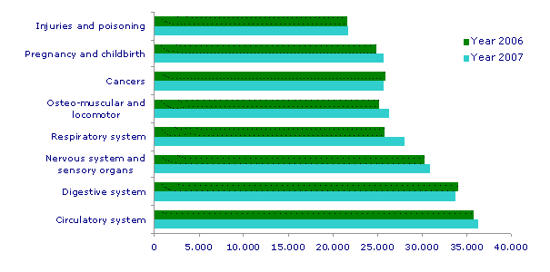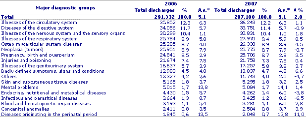 Respiratory diseases stood out as they were up by 8.5% compared to 2007. This group, which is the fourth most frequent cause of hospital admissions, had a greater incidence in January, February and December. Diseases during the perinatal period, which accounted for 0.7% of total discharges, also registered a notable increase of 11% compared to the previous year, mainly due to the conditions resulting from premature births and well birth weights.