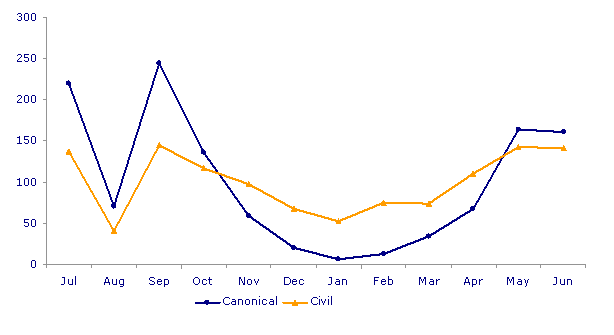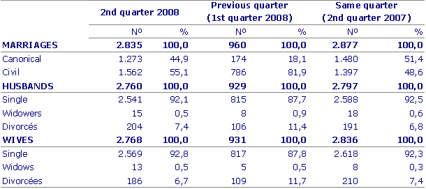 The percentage of civil weddings increased in the second quarter of 2008 with respect to the same quarter of the previous year