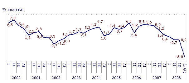 The month-on-month fluctuations in November 2008, compared to October 2008, were also negative, except in the case of Energy, which remained unchanged (0.0%). Capital Goods were down by 4.3%, Intermediate Goods fell by 3.1% and Consumer Goods decreased by 1.4%, due to the fall in the prices of Durable Consumer Goods (-1.3%) and Non-Durable Consumer Goods (-1.4% ).