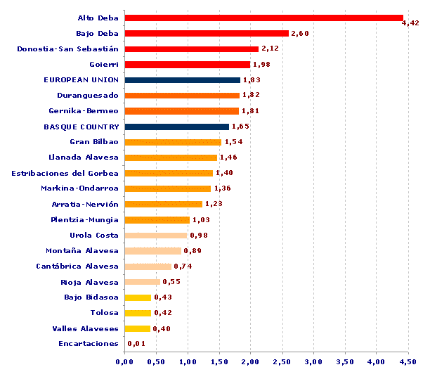 The Alto Deba district – comprising the municipalities of Antzuola, Aretxabaleta, Elgeta, Eskoriatza, Arrasate/Mondragón, Oñate, Leintz-Gatzaga and Bergara- headed the list of districts with the greatest investment in R&D. The district invested 4.42% of its GDPin 2007, according to Eustat data.