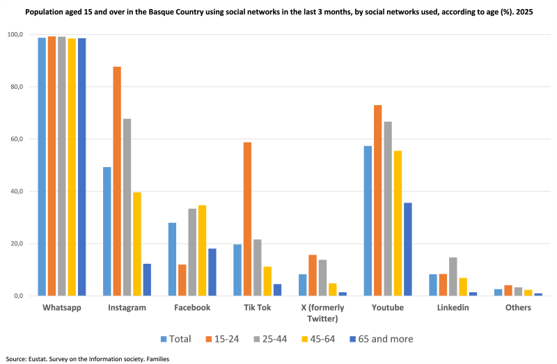 The use of social networks is widespread among the internet-using population of the Basque Country aged 15 and over (95.3%), with a very high adoption rate among the population aged 15 to 64, at 97.8%, but it decreases to 85.8% in the 65 and older age group. However, differences can be observed among social network users according to age. In addition to WhatsApp, the most used across all age groups, surpassing 97%, Instagram stands out among the younger population (87.7%), but its use drops drastically among those over 65 years old (12.3%). Facebook is more popular in middle age groups (33.4% and 34.7%), losing relevance among both young and older populations. TikTok is clearly youthful (58.8% in the 15 to 24 age group) and has little presence among older people. YouTube maintains significant presence in all groups, although it declines with age.