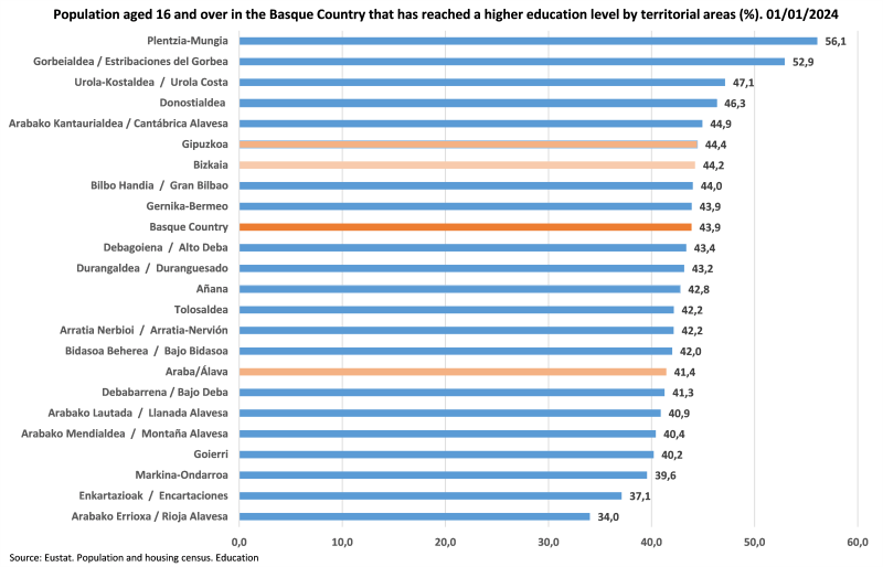 Plentzia-Mungia and Estribaciones del Gorbea reveal the highest proportion with higher education, along with Urola-Costa