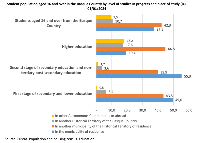 In 2024, more than half secondary and non-higher, post-secondary education students were studying in their own municipality (55.3%), followed by the group of students in the first stage of secondary education or lower (49.6%). As for the population aged 16 and over in the Basque Country that pursued university studies or advanced level vocational training, 44.8% (47,263 people) moved to a municipality within their home province. At this level of education, it is worth highlighting that 18.2% of students attended centres outside the Basque Country or abroad, a trend not seen at other education levels.