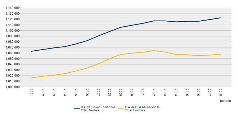 Evolución de la Población de la C.A. de Euskadi por sexo y periodo. 2001-2018.