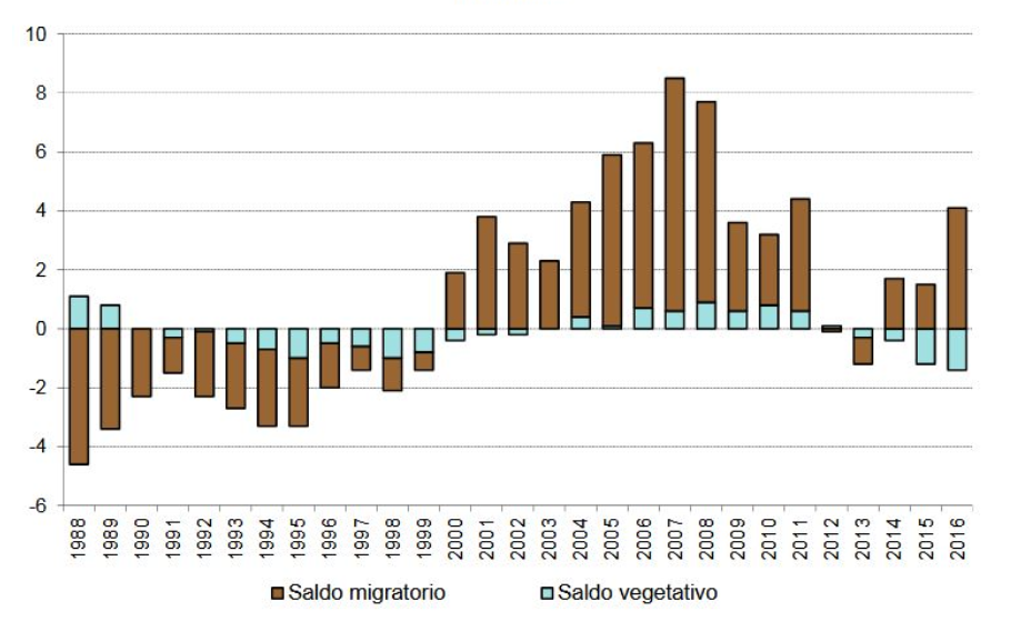 Durante casi todo el periodo 2001-2017 el saldo migratorio ha compensado el saldo vegetativo excepto en el bienio 2012 y 2013. Según la Estadística de Movimientos Migratorios en el año 2017 el 51% de las personas inmigrantes fueron hombres y el 49% mujeres, mientras que entre las personas emigrantes la diferencia entre sexos fue mayor, con un 54% hombres y un 46% mujeres.