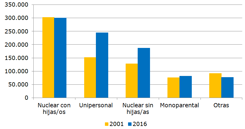 La forma de convivencia familiar más frecuente en viviendas familiares incluye la convivencia con hijos e hijas, y es el caso de 300.200 familias en el año 2016, según cifras de la Encuesta Demográfica. Le siguen en número las familias unipersonales –personas que viven solas- en torno a 245.000 en al año 2016, y su número ha crecido notablemente entre 2001 y 2016 en más de 90.000-. Así mismo el número de las parejas sin hijas/os en el hogar también ha aumentado en el periodo mencionado; aunque actualmente tiende a la estabilidad se cifró en 187.300 en el año 2016.